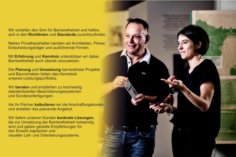 Ja, wir beraten zu Materialien und Farbkontrasten, um eine hohe Sichtbarkeit und sichere Orientierung zu gewährleisten. Dabei berücksichtigen wir sowohl funktionale Anforderungen als auch die optische Integration in den Raum.